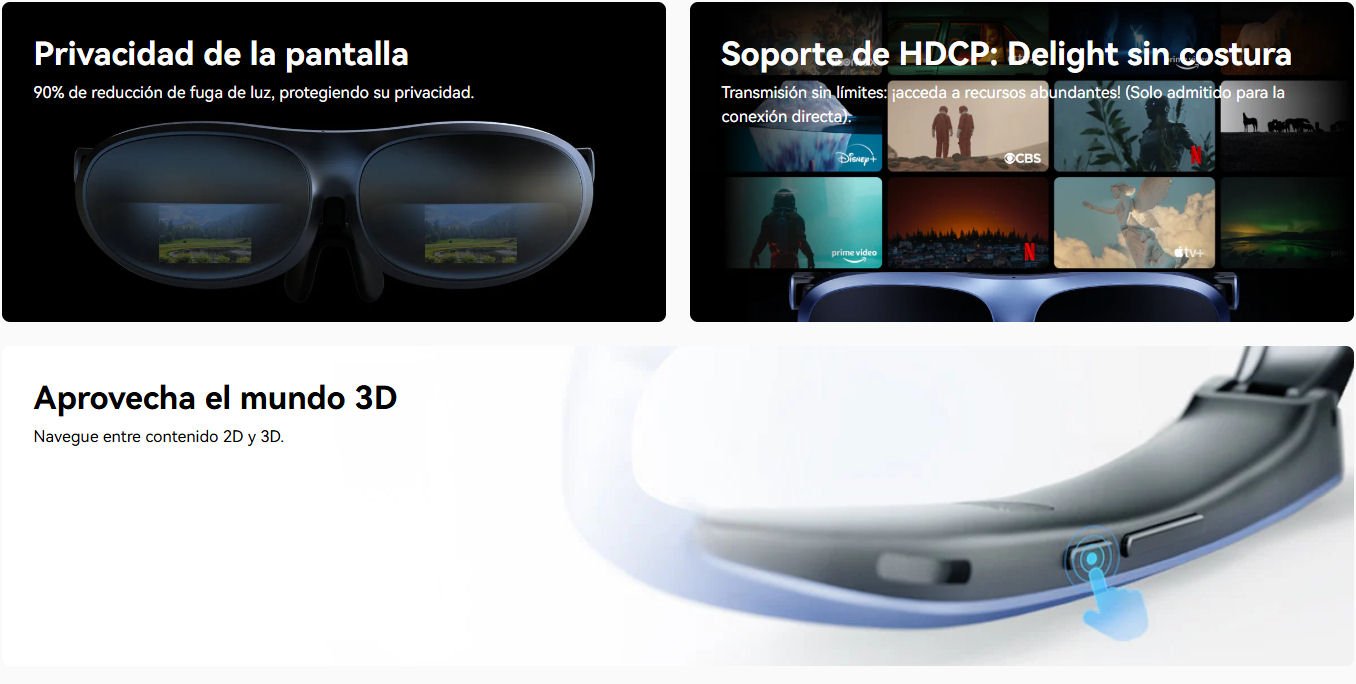 Lentes de realidad mixta Rokid Max AR, donde puedes ver cualquier pantalla, película, videojuego que quieras, donde quieras, ya sea en un Computador, Consola de Sobremesa, Dispositivo Portátil como celulares, y muchos más.